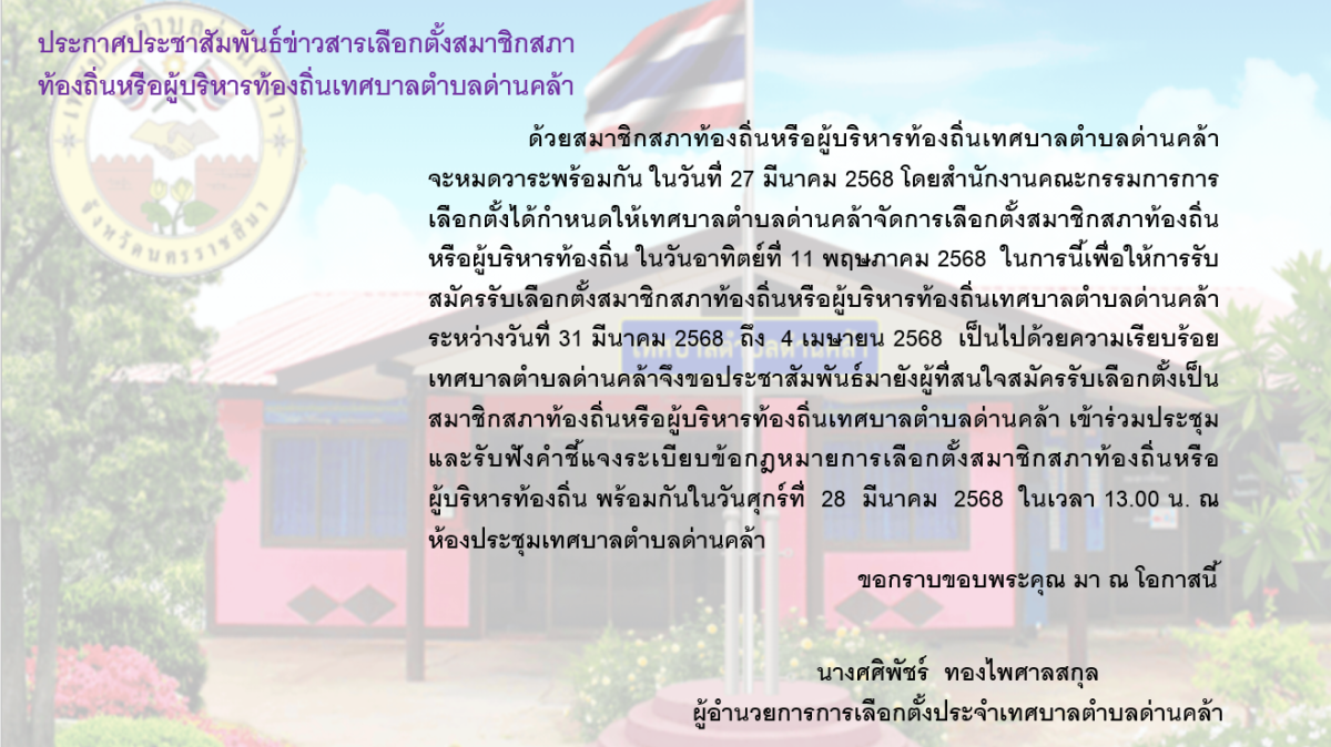 เทศบาลตำบลด่านคล้าขอประชาสัมพันธ์ข่าวสารให้พี่น้องประชาชนได้รับทราบ รถกู้ชีพเทศบาลตำบลด่านคล้า จะเข้ารับการซ่อมแซมบำรุงรักษาไฟส่องสว่างภายนอกรถและภายในห้องโดยสาร เพื่อความปลอดภัยแก่ผู้ใช้บริการและผู้ปฏิบัติงาน จึงงดให้บริการชั่วคราว ในวันที่ 20 – 21 สิงหาคม 2568 ทั้งนี้ เมื่อพร้อมให้บริการแล้วจะแจ้งให้ทราบต่อไป
