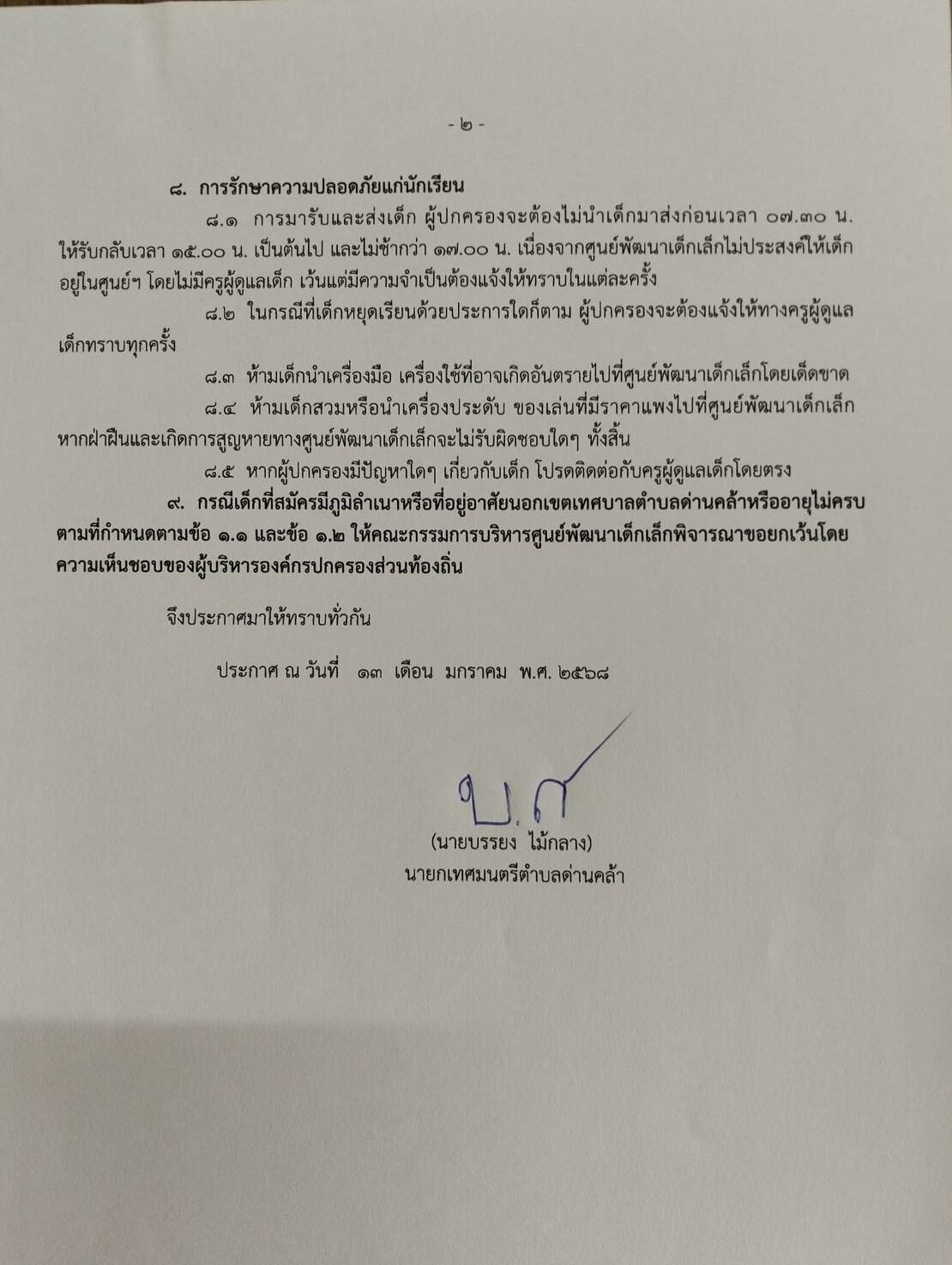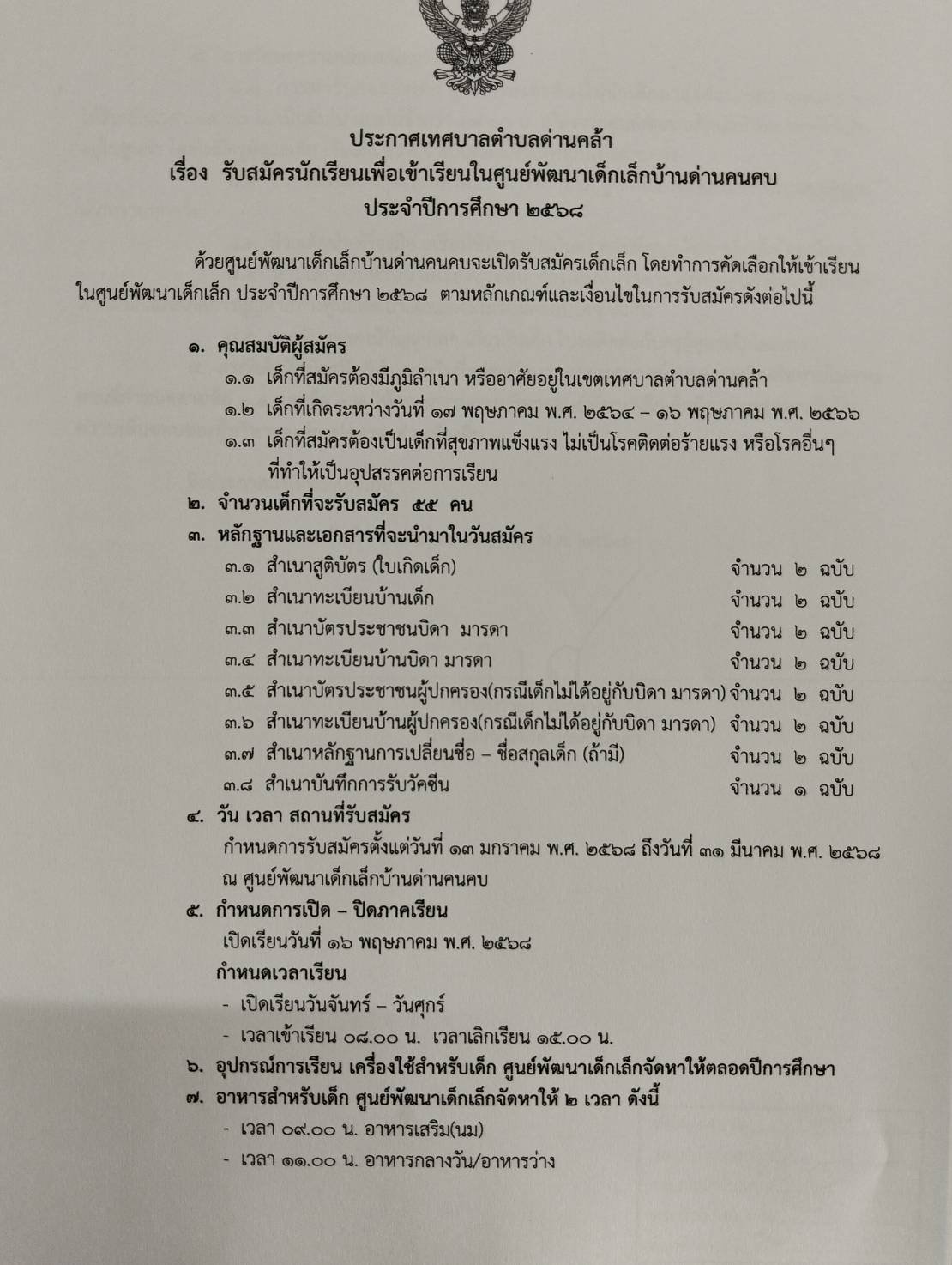 ขอประชาสัมพันธ์ – ศูนย์พัฒนาเด็กเล็กบ้านด่านคนคบ สังกัดเทศบาลตำบลด่านคล้า เปิดรับสมัครเด็กเล็ก เข้าเรียนในศูนย์พัฒนาเด็กเล็ก ประจำปีการศึกษา 2568 ระหว่างวันที่ 13 มกราคม – 31 มีนาคม 2568 ในวันและเวลาราชการ ณ ศูนย์พัฒนาเด็กเล็กบ้านด่านคนคบ รายละเอียดการรับสมัครตามประกาศที่แนบมาด้วยค่ะ