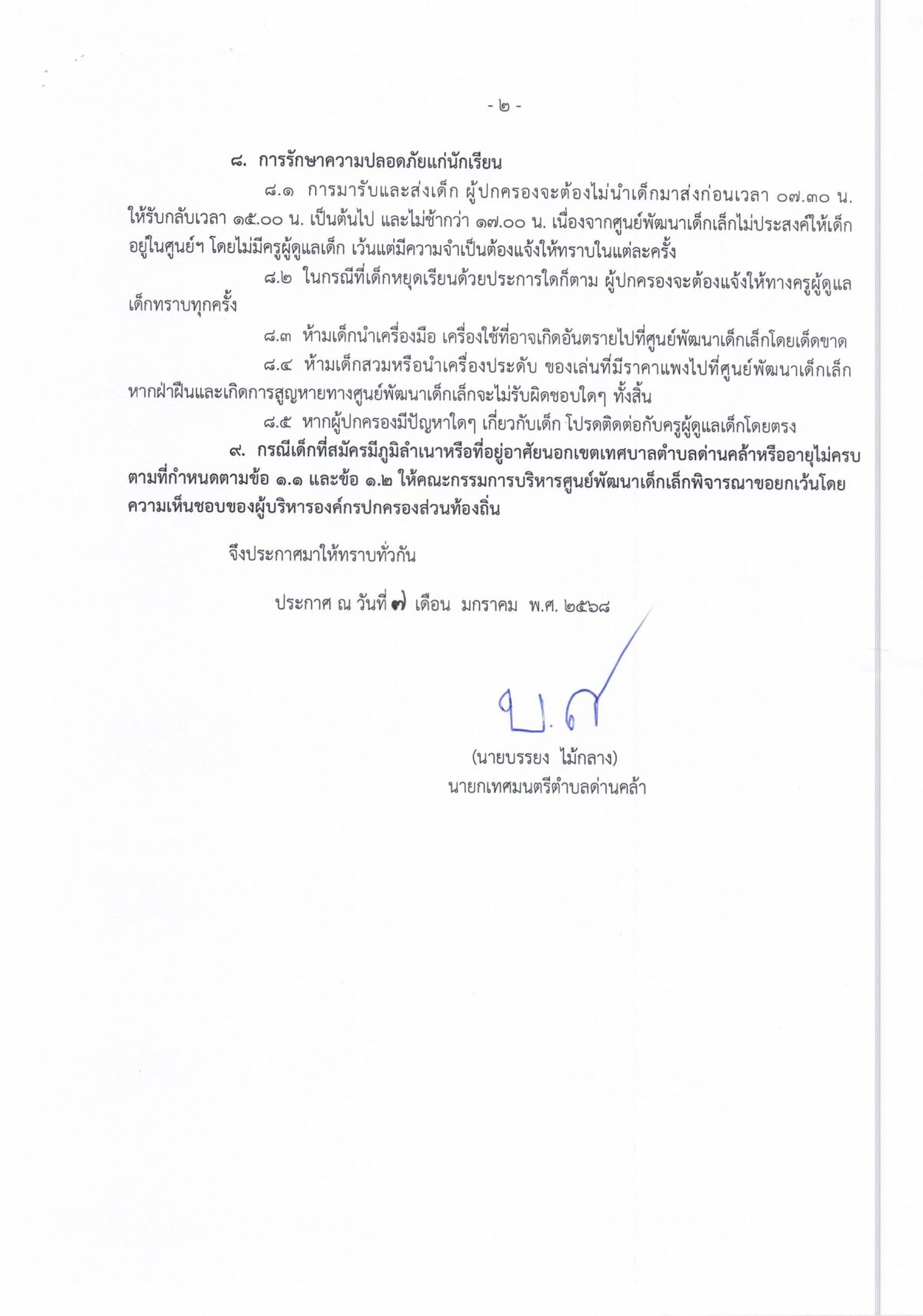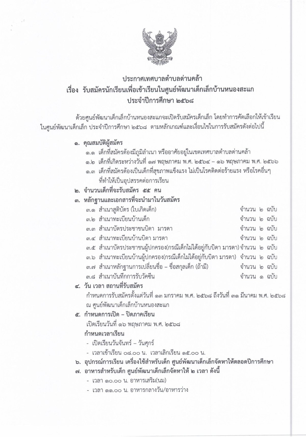ขอประชาสัมพันธ์ – ศูนย์พัฒนาเด็กเล็กบ้านหนองสะแก สังกัดเทศบาลตำบลด่านคล้า เปิดรับสมัครเด็กเล็ก เข้าเรียนในศูนย์พัฒนาเด็กเล็ก ประจำปีการศึกษา 2568 ระหว่างวันที่ 13 มกราคม – 31 มีนาคม 2568 ในวันและเวลาราชการ ณ ศูนย์พัฒนาเด็กเล็กบ้านหนองสะแก รายละเอียดการรับสมัครตามประกาศที่แนบมาด้วยค่ะ