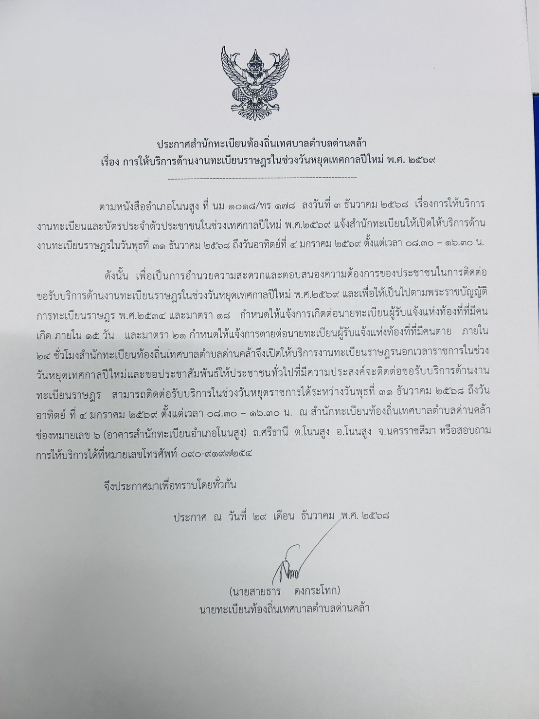 เทศบาลตำบลด่านคล้าขอประชาสัมพันธ์>>>สำนักทะเบียนท้องถิ่นเทศบาลตำบลด่านคล้า เปิดให้บริการงานทะเบียนราษฎร ในช่วงวันหยุดเทศกาลปีใหม่ พ.ศ.2569 ระหว่างวันที่ 31 ธัน
